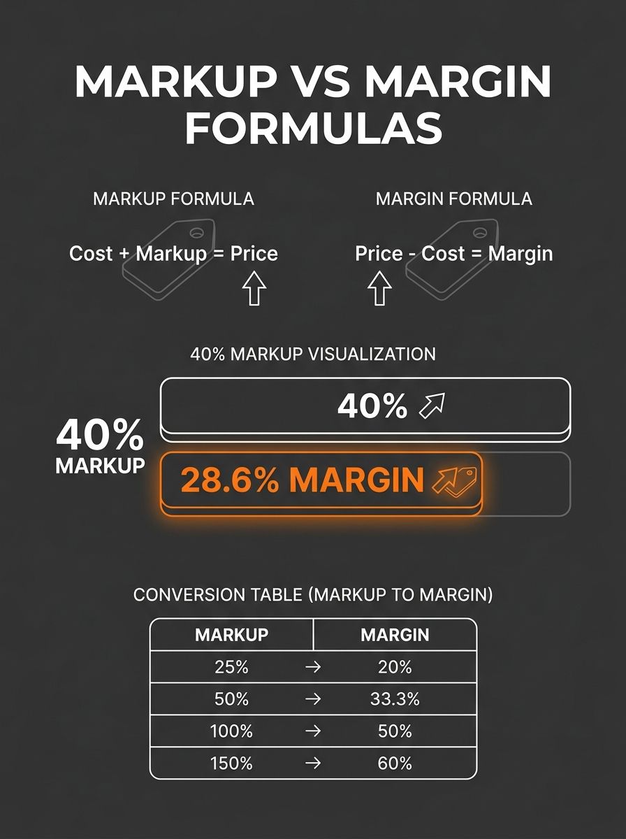A 40% markup on a $15 product gives you a $21 selling price and $6 in gross profit. Divide that $6 by the $21 sale price and you get 28.6%, which is your actual gross margin. The 11.